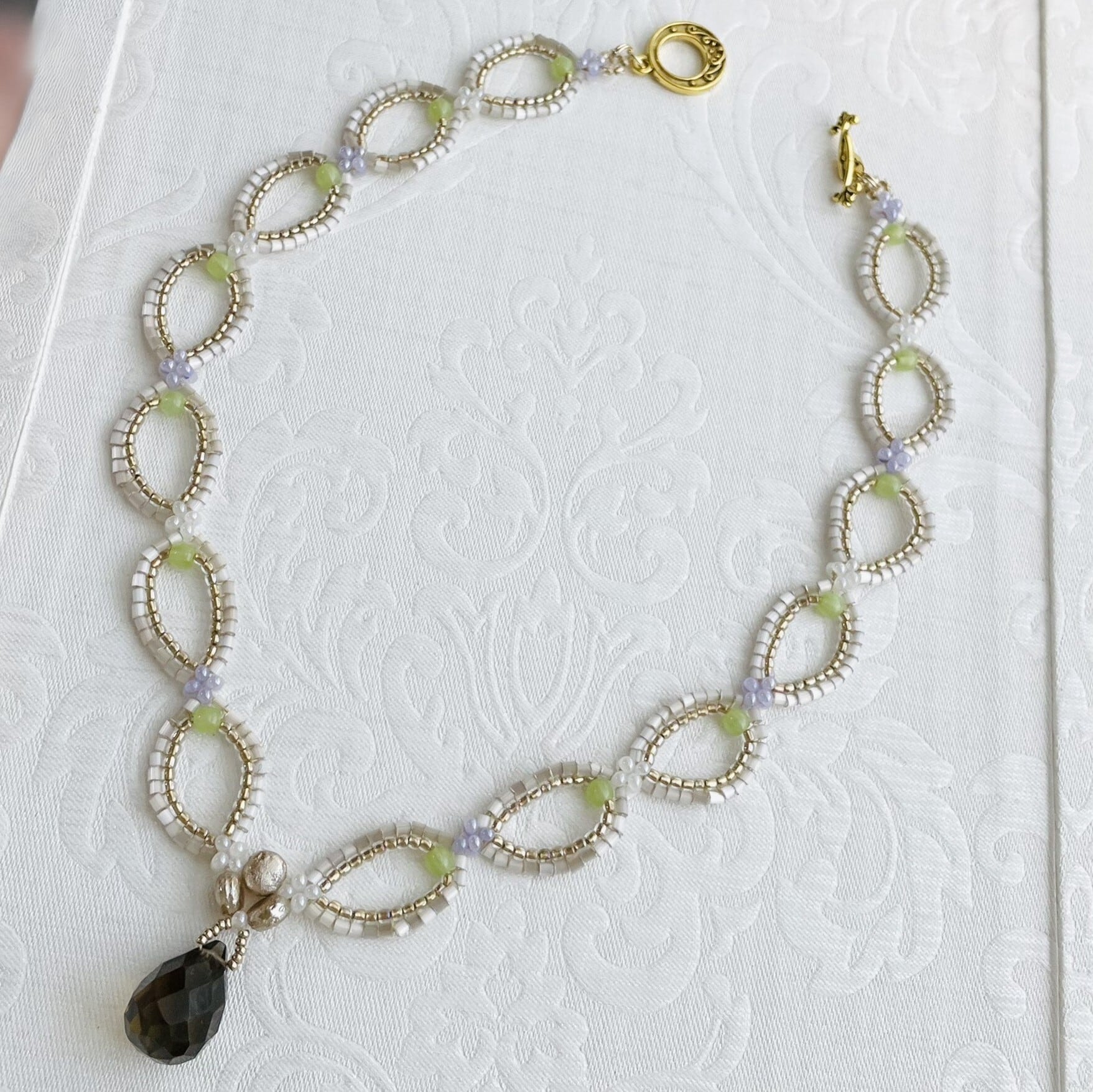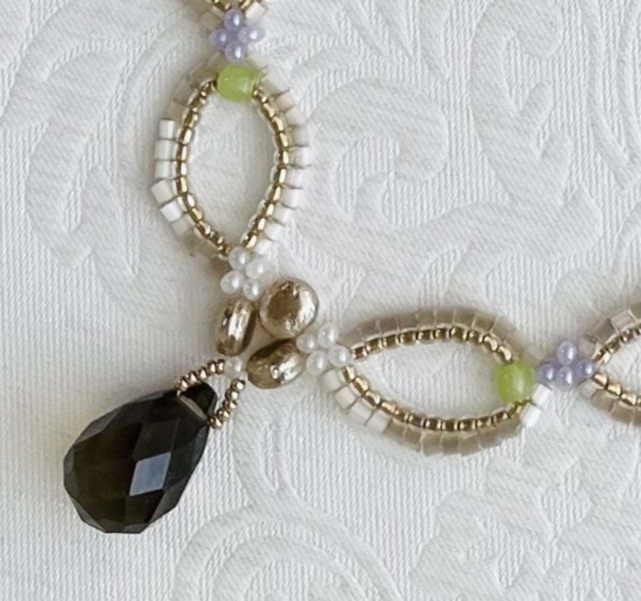 スモーキークォーツネックレスは、透明感のある美しいブラウンのスモーキークォーツドロップを使用した、エレガントなアクセサリーキットです。ゴールドとシルキーカラーのカットビーズを巧みに編み込むことで、洗練された仕上がりに。差し色には、チェコビーズのグリーンが鮮やかに映え、独自の個性を引き立てます。