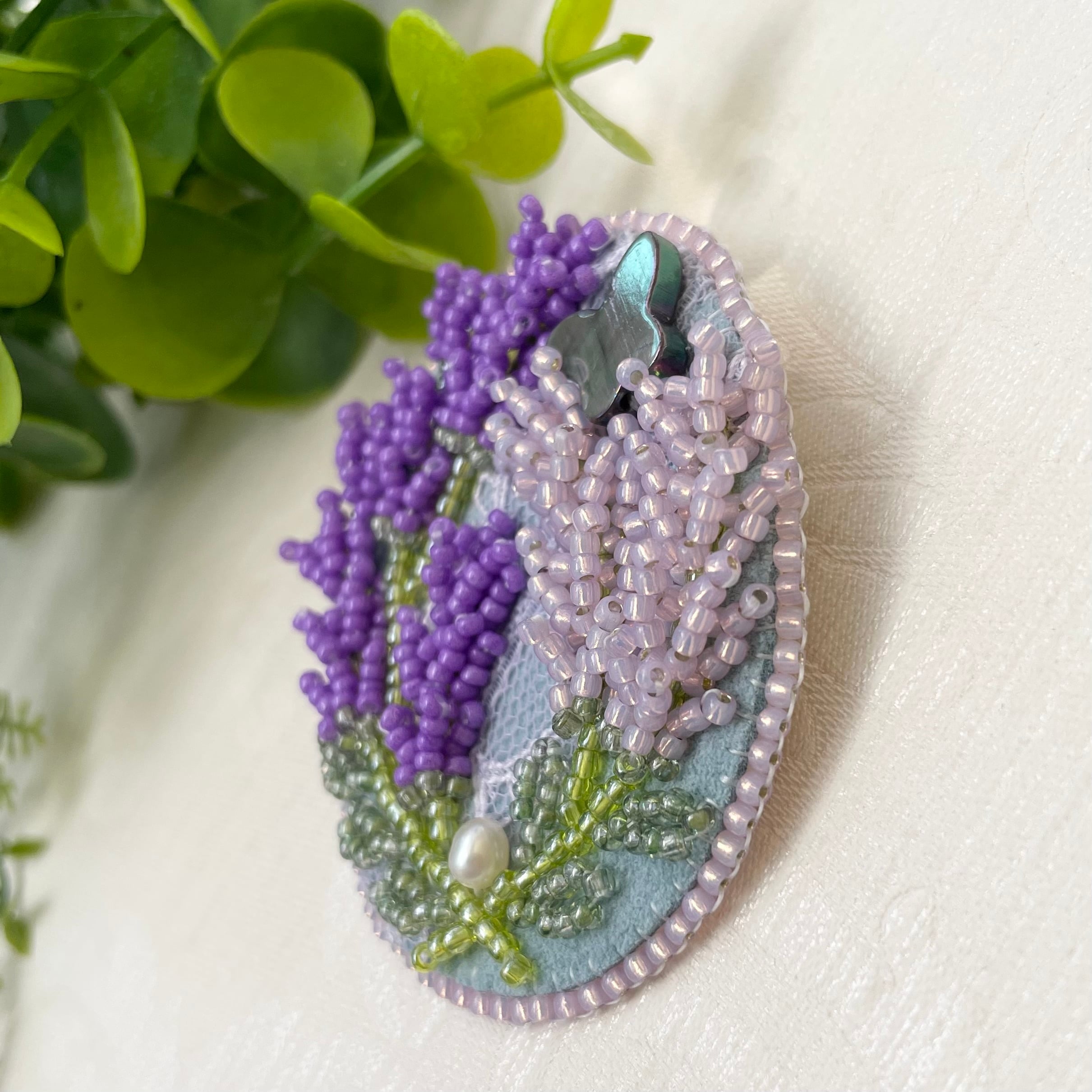 ふんわりと香りが漂ってきそうな2色のラベンダーをビーズ刺繍して仕立てます