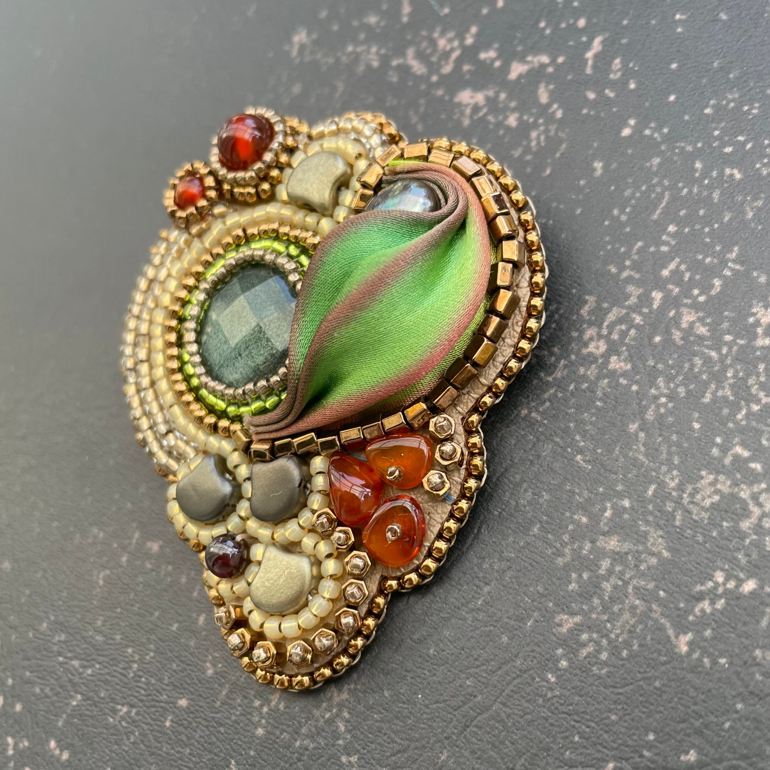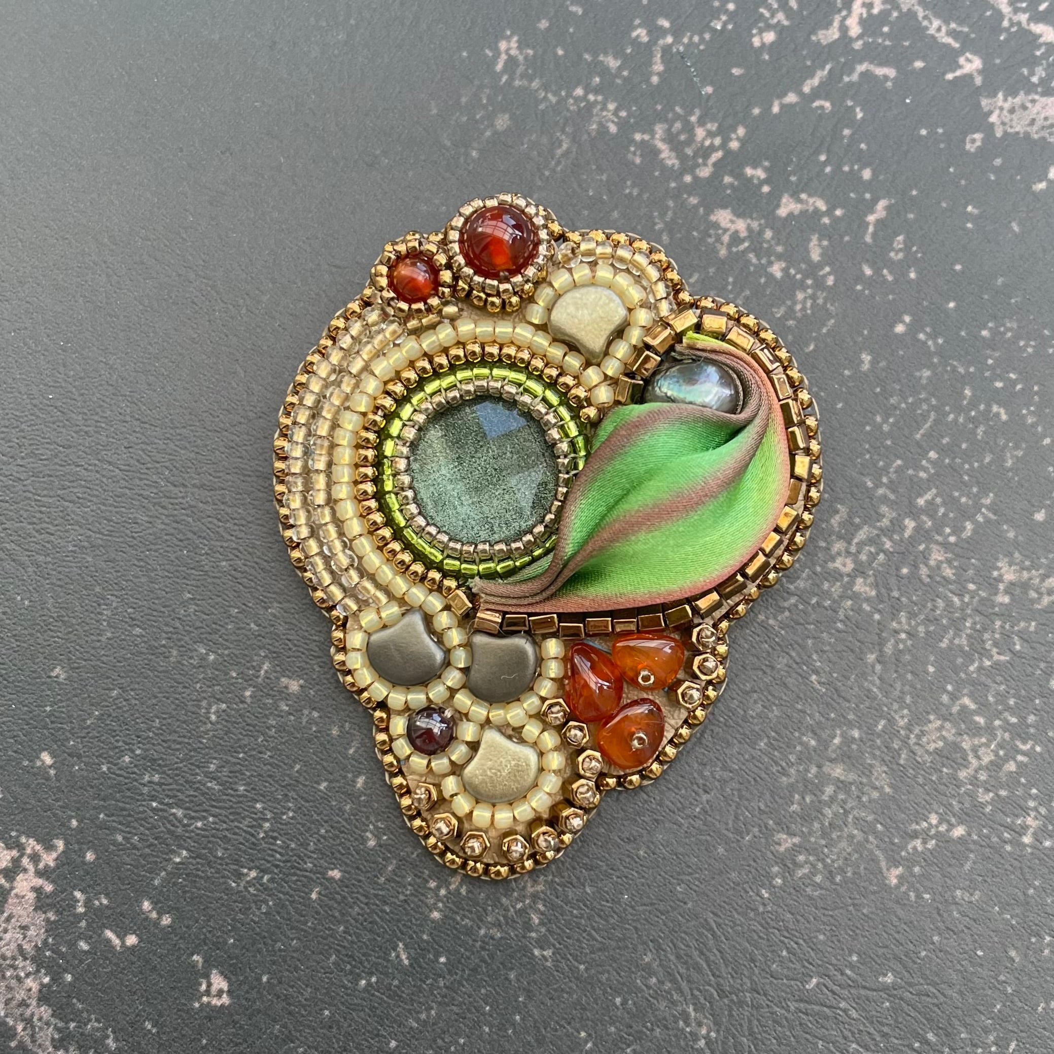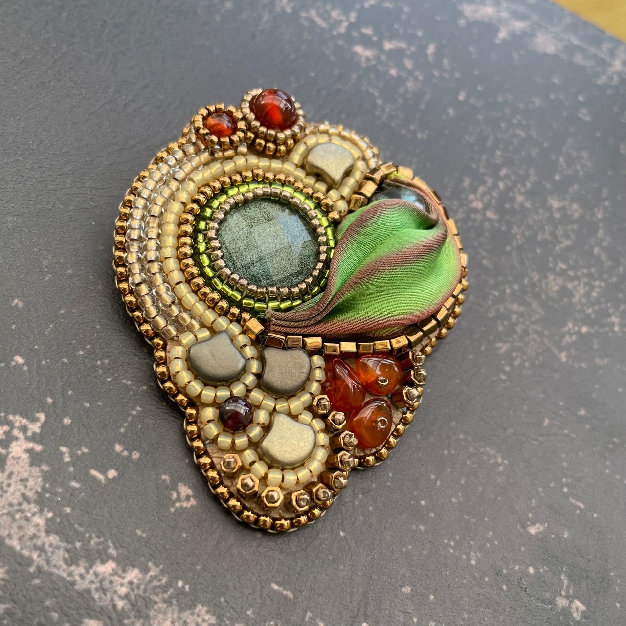カットの入ったカボションを小さなビーズで留め、チェコパーツ・淡水パール・ガーネット・琥珀・カーネリアン・メノウなどのパーツなど飾って頂きます。