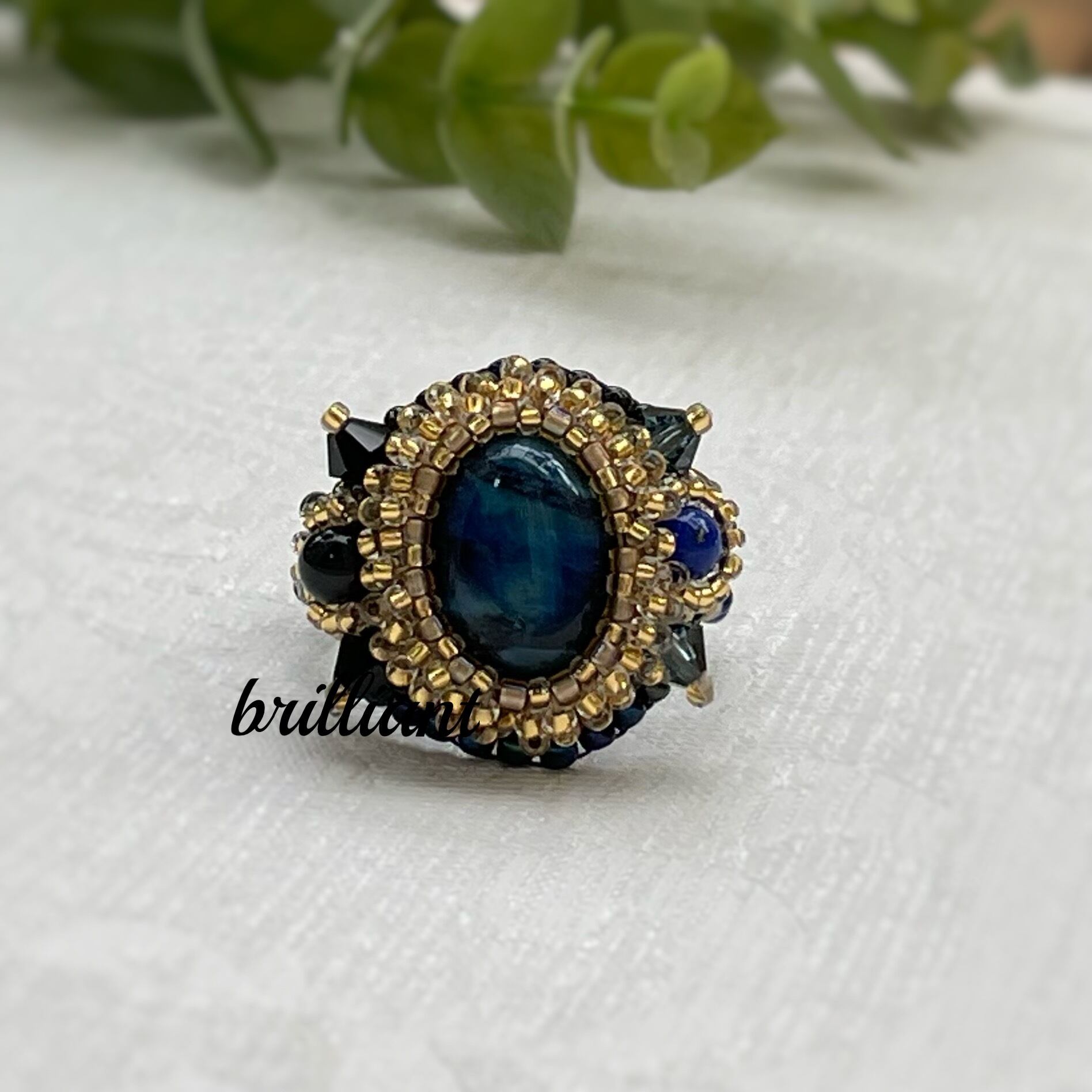 奥深い色合いのブルータイガーアイのカボションを中心に、左右にラピスラズリとオニキスを飾り、シックな雰囲気のあるリングに仕立てます。