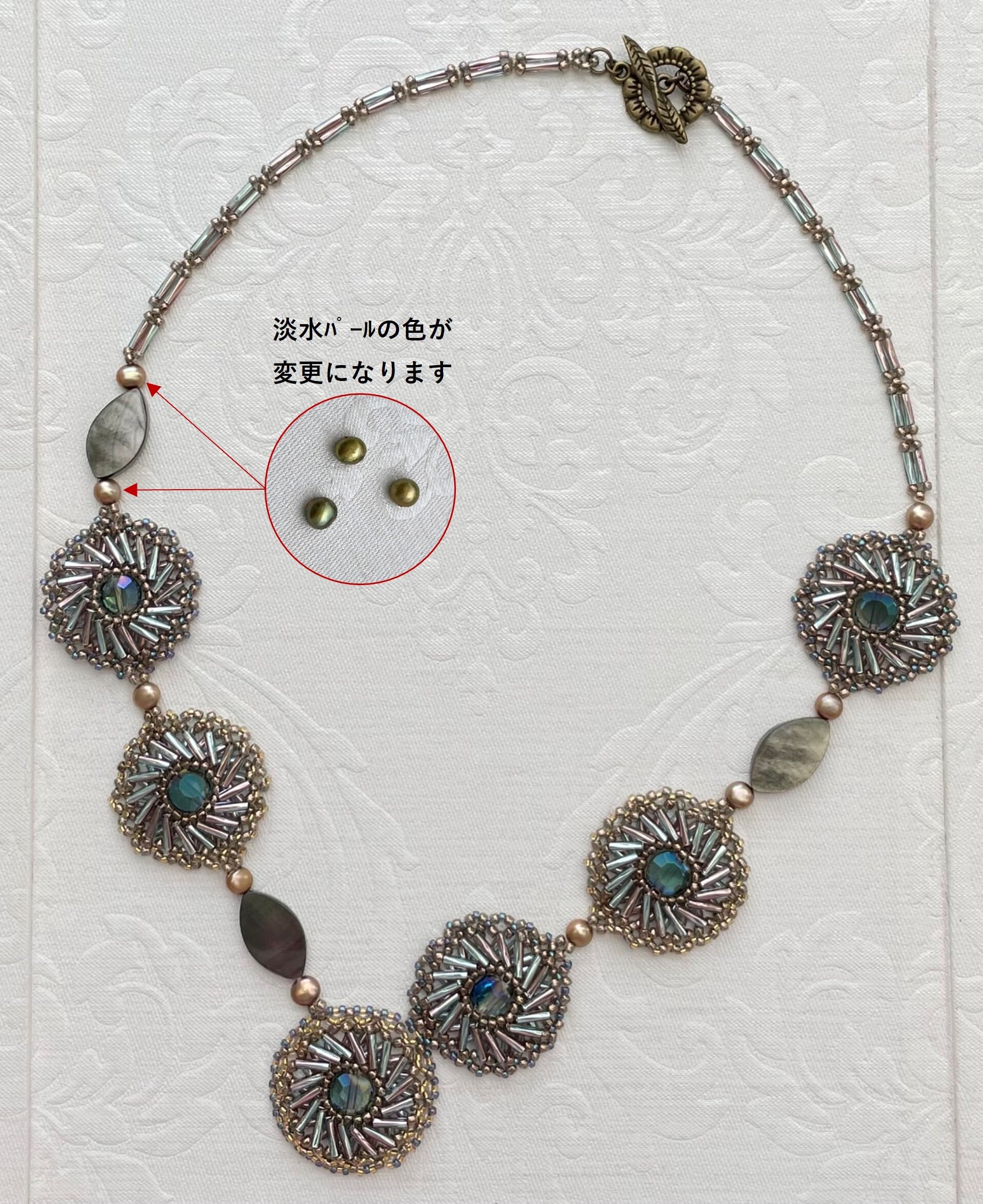 キラキラと輝くカットガラスを中心に、竹ツイストビーズでスパイラル模様を施した手作りキット、キャロルネックレスです。平面な仕上がりながらもしっかりとした作りで、上品な印象を与えるネックレスに仕上がります。シェルパーツや淡水パールを使い、さりげなく華やかさもプラスしました。